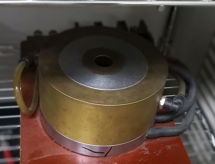 磁力轮的磁铁,我们加工生产出来之后,是没有磁铁,我们要把它变成磁铁,就需要用到下面的这个设备,充磁机和充面夹具。