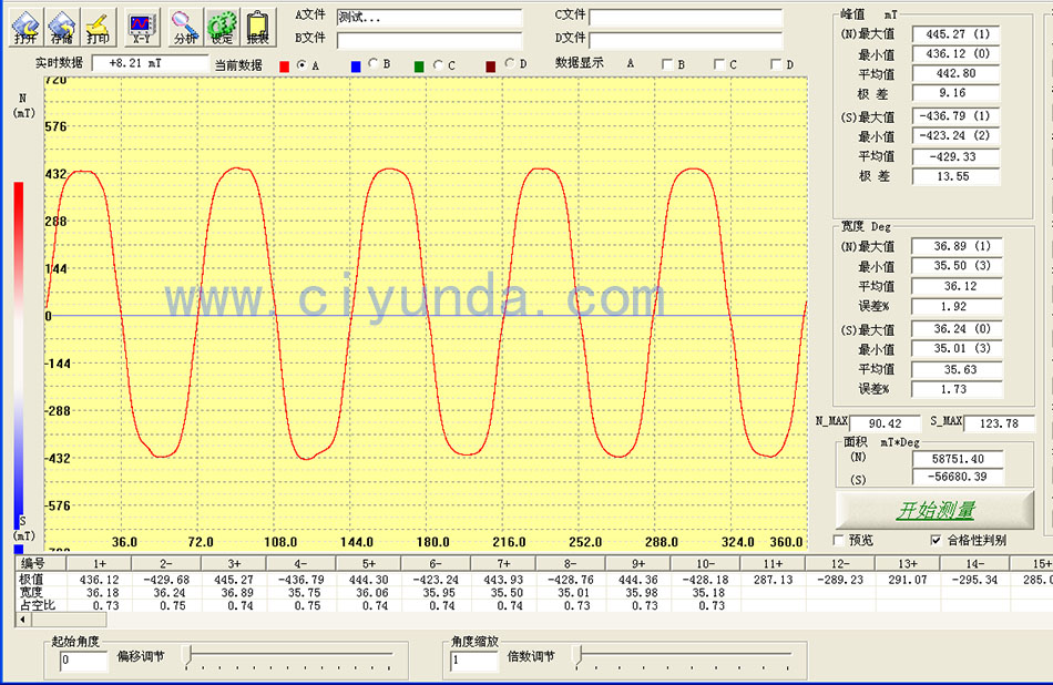 峰值是指每一个磁极的磁感值的最高点,单位为mT,1mT=10高斯。上图我们可以看到有10个峰值,也就是说这个磁力轮是10级的。由于每个磁析的峰值不可能完全相等,所以有峰值的最大值,最小值,还有平均值。极差则是最大值和最小值之间的差。