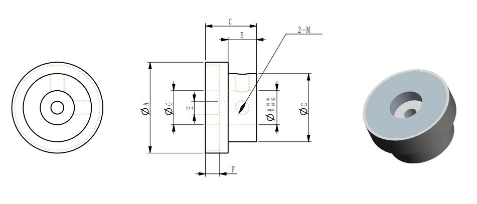 | 型号 | 外径A | 可选内孔B | 高度C | D | E | F | G | H | M | 传动扭力N.m | |